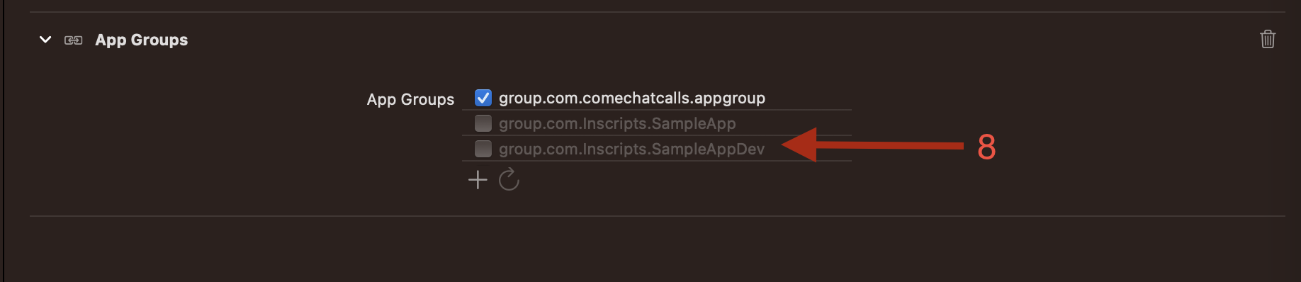 - Select any of the suggested app group ID or you can add your own ID by clicking on the plus icon. Till this step app group is added on the notification extension target and app group is selected.