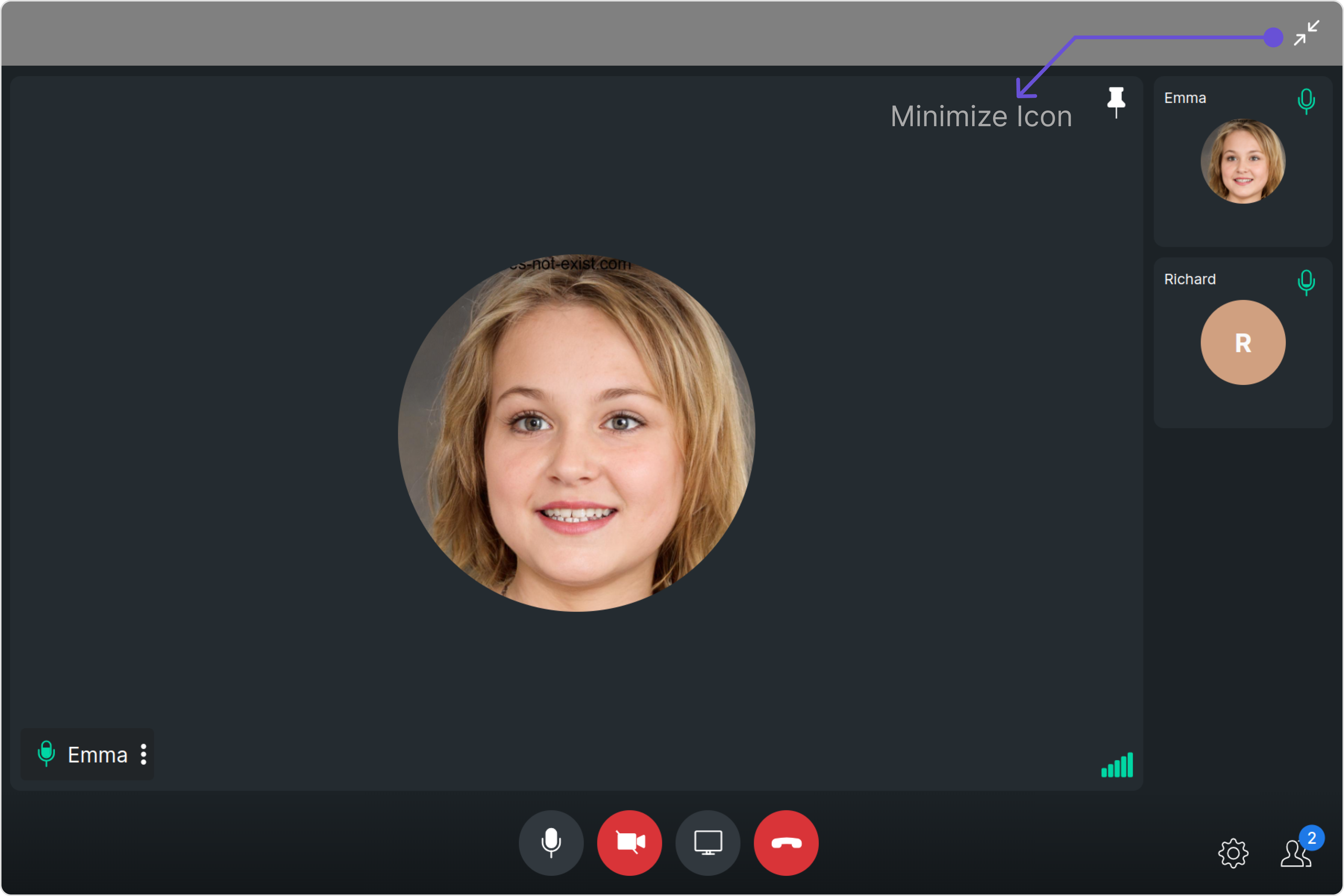 The Ongoing Call is a Component that provides users with a dedicated interface for managing real-time voice or video conversations. It includes features like a video display area for video calls, call controls for mic and camera management, participant information, call status indicators, and options for call recording and screen-sharing.
