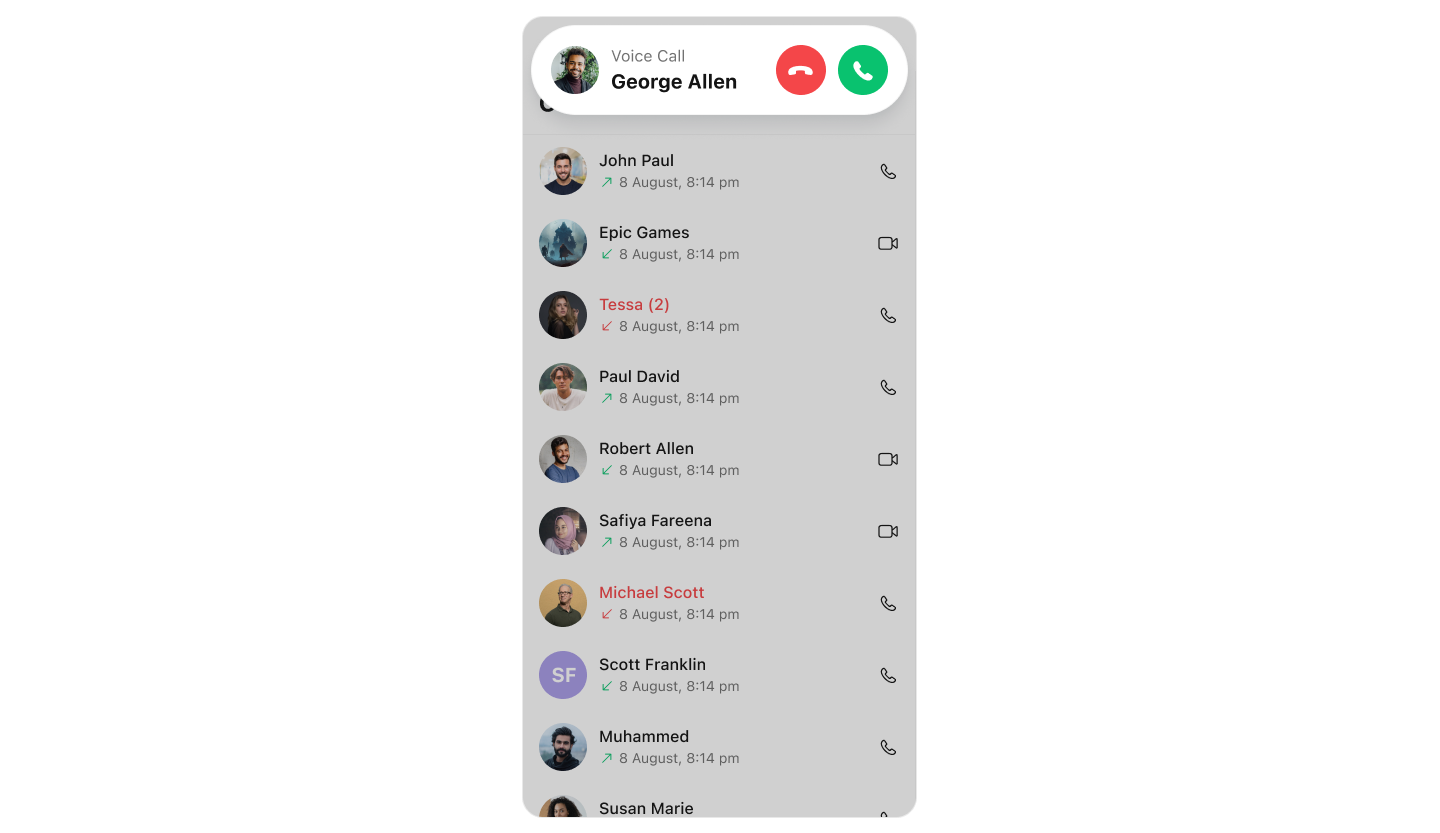 Call Logs component provides you with the records call events such as who called who, the time of the call, and the duration of the call. This information can be fetched from the CometChat server and displayed in a structured format for users to view their past call activities.