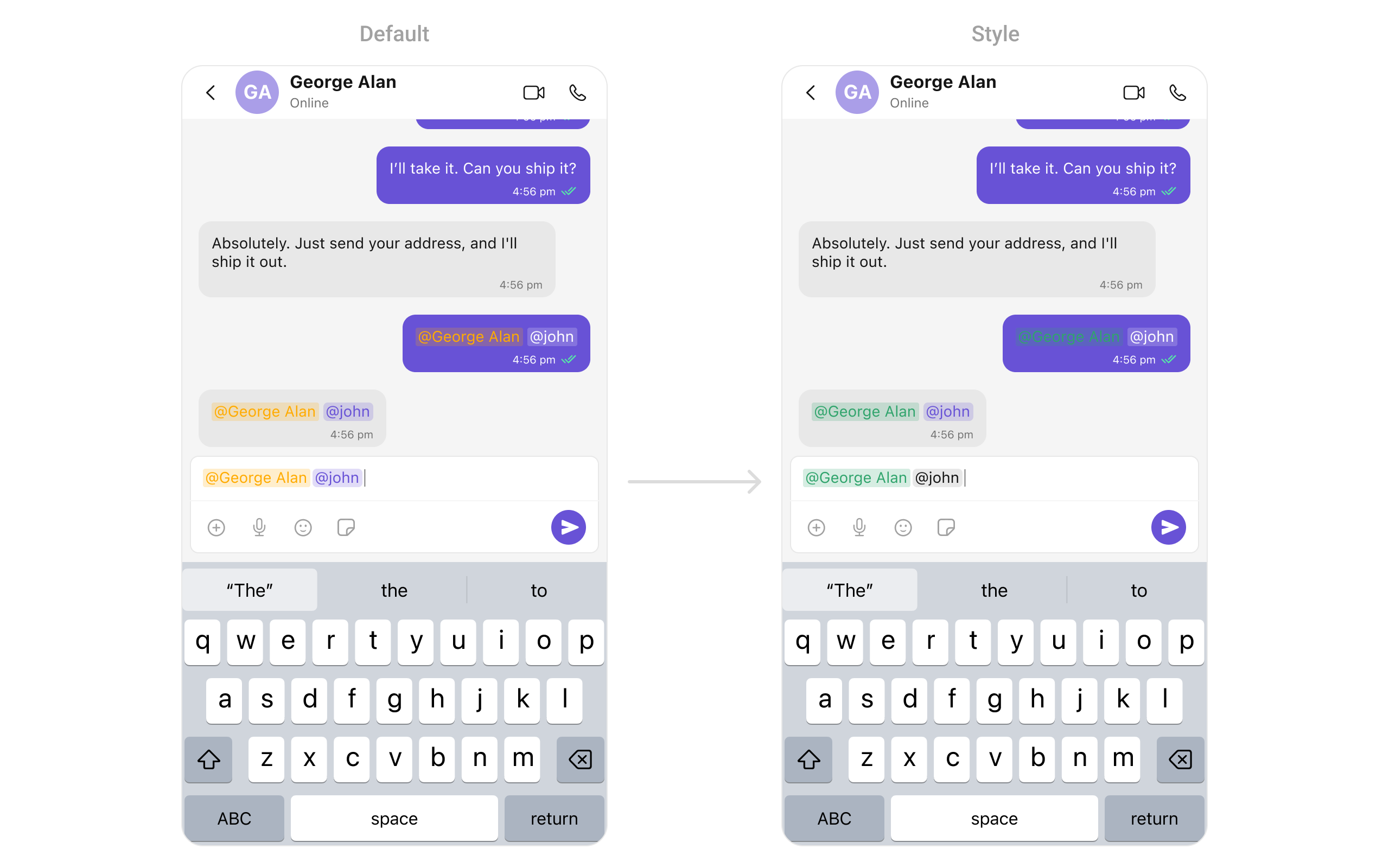 .set(leftBubbleTextStyle),.set(rightBubbleTextStyle),.set(composerTextStyle), and.set(conversationListTextStyle)methods to format text messages with mentions appropriately for display in the chat interface. - Customization: Customize the appearance and behavior of mentions by adjusting the text styles, colors, and other formatting properties as needed.