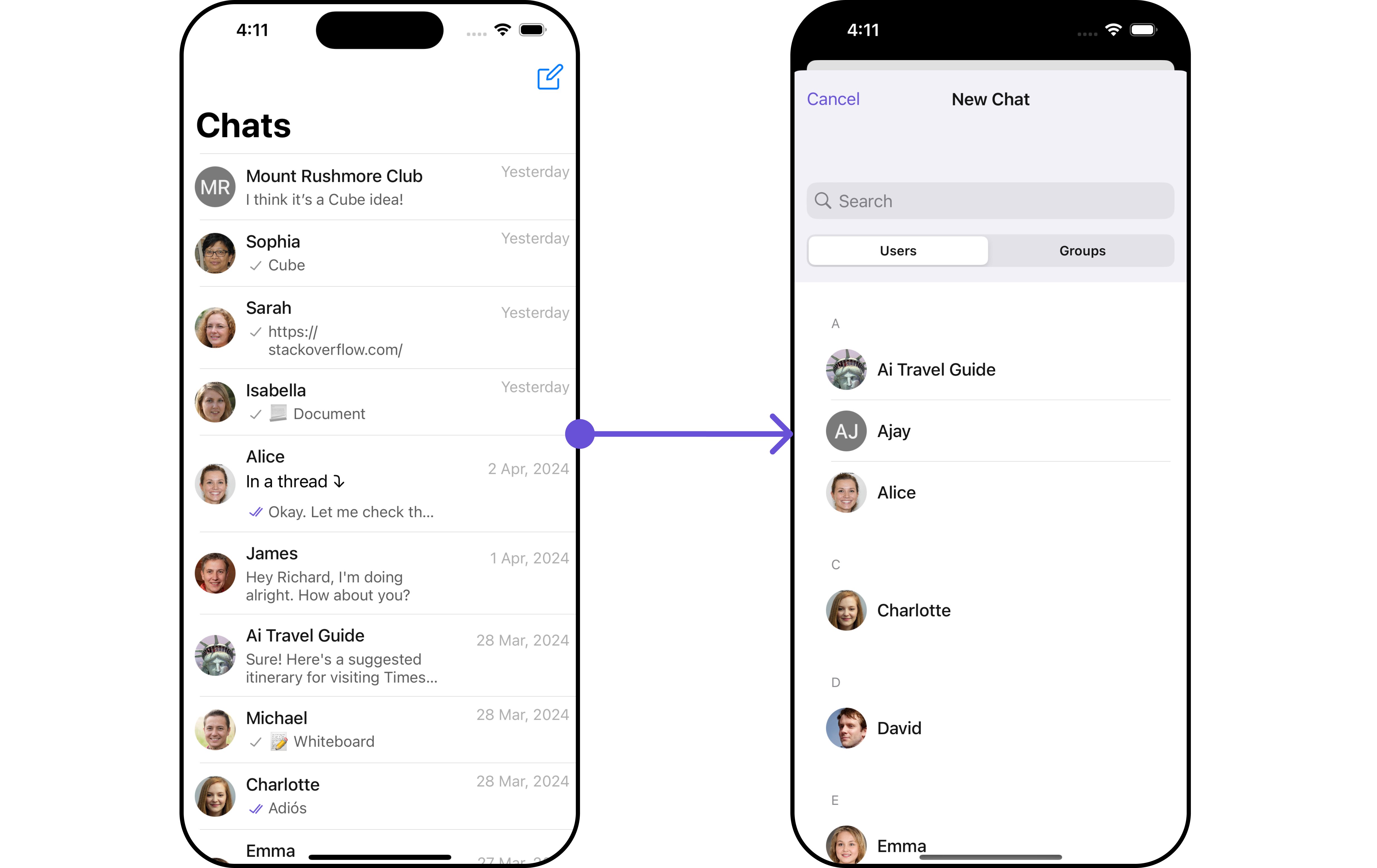 To fit your app’s design requirements, you have the ability to customize the appearance of the ConversationsWithMessages component. We provide exposed methods that allow you to modify the experience and behavior according to your specific needs.